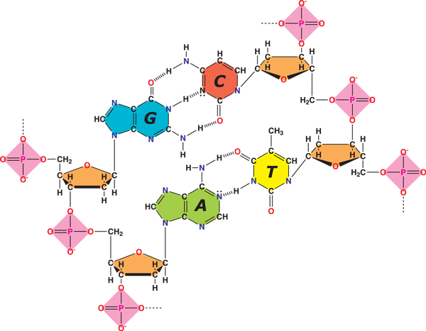 DNA-molekyletEt DNA-molekyle består faktisk af to strenge med A, T, G, og C’er. De to strenge hænger sammen via forskellige kemiske bindinger, men det er især hydrogenbindingerne mellem baserne på de to strenge, der får DNA til at hænge sammen. Det har vist sig, at nucleotiderne altid findes i par, således vil der altid være A over for T og G over for C. Dette skyldes, at baserne netop kan danne hydrogenbindinger i disse par, mens andre par, fx A-G eller C-C ikke danner hydrogenbindinger. Konsekvensen af dette er, at hvis man kender rækkefølgen, sekvensen af nucleotider i den ene streng, vil man også kende sekvensen i den anden streng. Man kan sige, at den ene streng er en omvendt kopi af den anden, og med den ene DNA-streng kan man lave kopier af den anden, se figur 4.