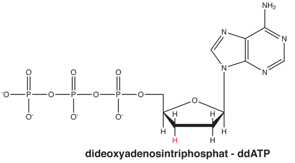 Dette udnyttes, når cellerne deler sig til to nye celler. DNA’et kopieres til den nye celle ved, at DNA-strengene kopieres hver for sig, og to nye DNA-molekyler dannes. Alt dette foregår ved, at et enzym, DNA-polymerase, aflæser sekvensen på den streng, der kopieres, og opbygger en ny streng, der passer i sekvens. DNA-polymerase enzymet bygger DNA-molekylet op af nucleotider med tre phosphatgrupper. Ved sammenkoblingen bliver de yderste to phosphatgrupper spaltet fra og leverer herved kemisk energi til reaktionen, se figur 5.
