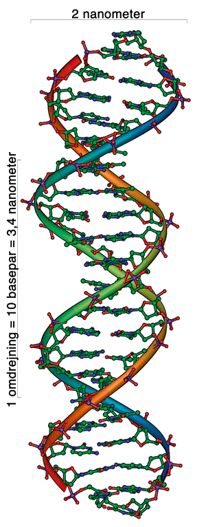 DNA-helixDNA-molekylets to strenge snor sig omkring hinanden i en struktur, der ligner en vindeltrappe, hvor de enkelte base-par danner trappetrinnene, og phosphat-ribosekæderne danner siderne. Denne struktur kaldes en DNA-helix. Det er en overordentlig genial struktur, hvor ydersiden, der består af phosphat-ribosekæderne, er meget hydrofil og derfor meget opløseligt i vand. Vi skal huske, at de fleste levende organismer består af ca. 80% vand. Phosphat-ribosekæderne er også meget modstandsdygtige overfor kemisk nedbrydning, hvilket gør DNA stabilt. Inde i helixen findes baserne, som er beskyttet mod fx kemisk eller enzymatisk nedbrydning, se figur 6. Den enkelte hydrogenbinding er svag, men da der er 2-3 hydrogenbindinger pr. basepar, sikrer den samlede effekt af de mange hydrogenbindinger, at DNA-strengene holdes sammen. Bindingerne kan dog relativt let brydes, hvis temperaturen hæves til ca. 100 °C.