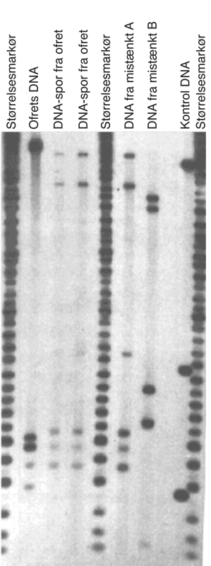 En kvinde er blevet voldtaget, der er to mistænkte. DNA-prøver af ofret selv, DNA-spor på ofret, og af de to mistænkte udtages. DNAet skæres med enzymer og analyseres ved hjælp af gelelektroforese. Ved at sammenligne mønstrene fra DNA-sporene med de mistænktes DNA er det tydeligt, hvem der er den skyldige. Kvindens DNA er med i analysen, som bevis på at DNA-sporene ikke stammer fra hende selv. |