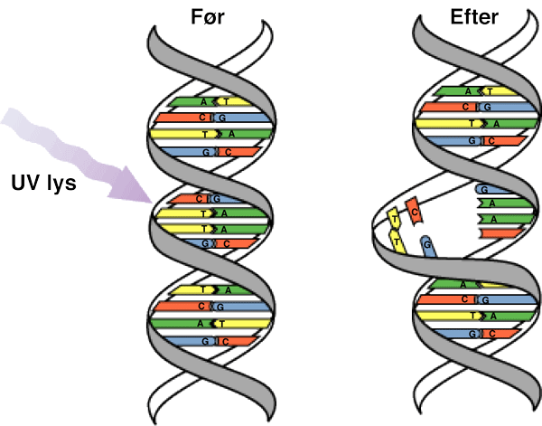 To T’er ved siden af hinanden i DNA-sekvensen kan reagere og binde til hinanden, hvis de udsættes for UV-lys eller Røntgen-stråling. Dette kan resultere i fejl, når DNA'et efterfølgende kopieres. Herved kan der opstå mutationer. |