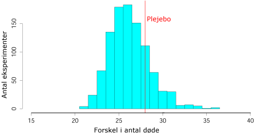 Dette eksperiment er gennemført 1.000 gange for p = 27/730, en sandsynlighed, der gør begge Plejebo25