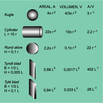 Areal, volumen og overflade/volumenforholdet for fem forskellige geometriske former.