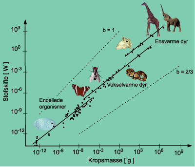 Stofskiftet afhænger inden for forskellige dyregrupper af krops-vægten i potensen b = 3/4. Dyregruppernes stofskifte adskiller sig indbyrdes med forskellige normaliseringskonstanter (a), som er meget lavere hos vekselvarme krybdyr og insekter end hos ensvarme fugle og pattedyr.