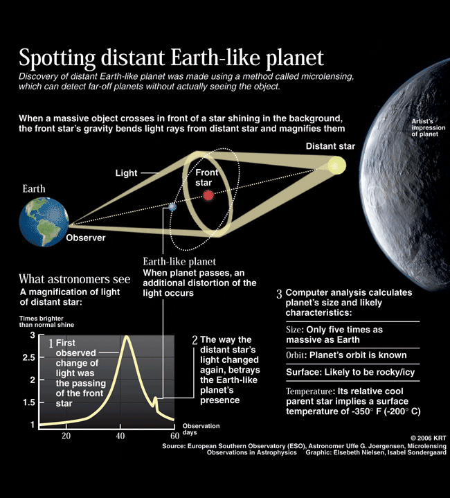 MikrolinseteknikkenDen metode, der er mest følsom til at afsløre planeter, som dem i vores eget solsystem, er den såkaldte mikrolinseteknik. I sommeren 2005 afslørede metoden den første jordlignende exoplanet, man har set. Det er en klode på 5 gange Jordens masse, der kredser om en M-type dværgstjerne mere end 20.000 lysår herfra i retningen af Mælkevejens centrum.